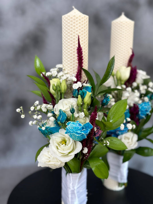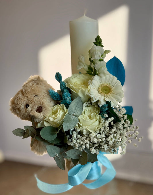 Lumânare Botez Băiețel cu Ursuleț și Flori Alb-Albastre