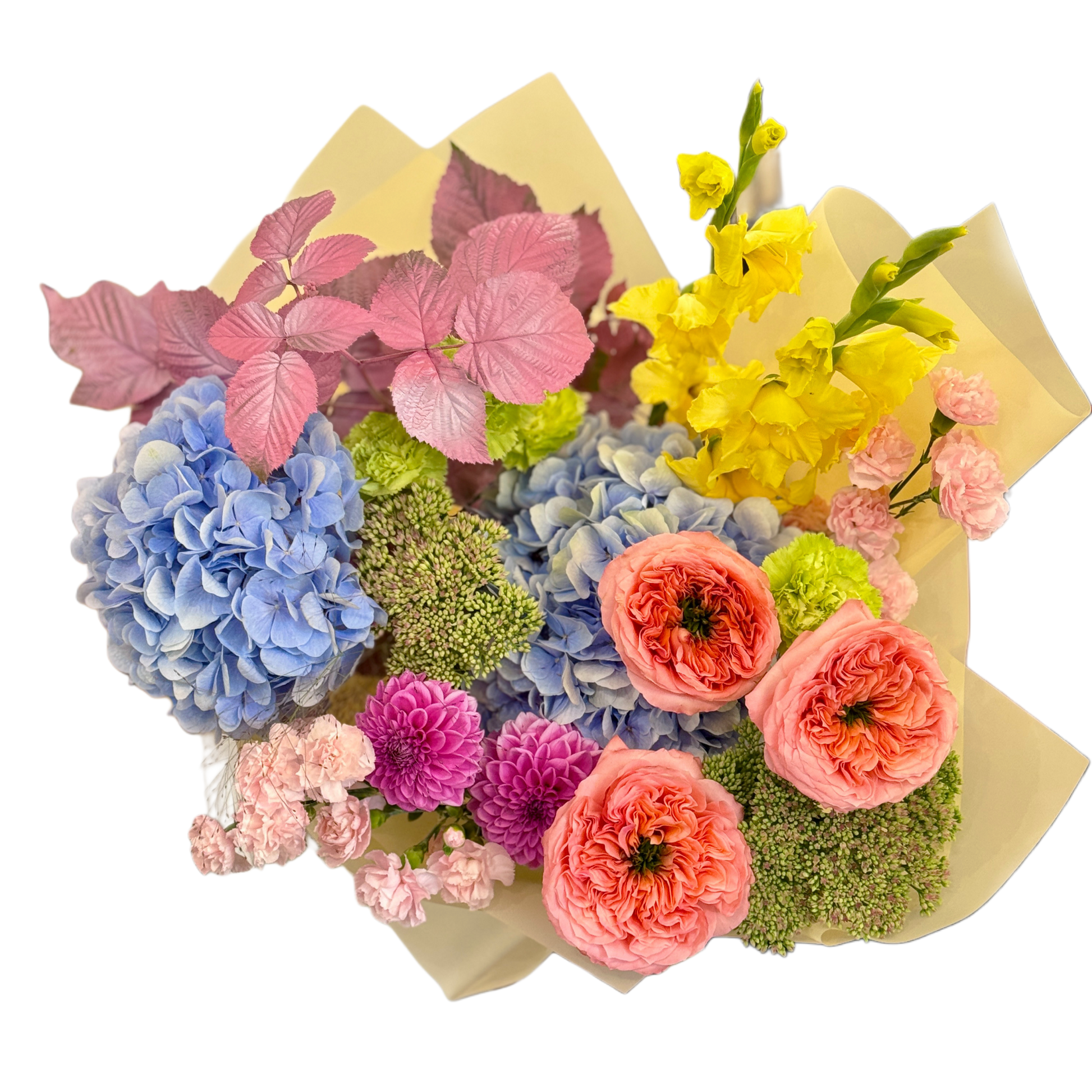 Un buchet vibrant și plin de energie, alcătuit dintr-o selecție spectaculoasă de flori: hortensii albastre, trandafiri corali, gladiole galbene, dalii mov și accente verzi. Jocul de culori calde și reci creează un efect vizual uimitor, perfect pentru a aduce bucurie și lumină în orice moment special.